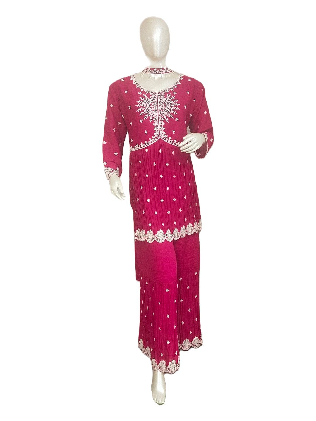 Jasvi Collections brings you an Exquisite Indowestern in Rani Colour fabric and Heavy All over Moti work. It has a ornate Plazo with moti work.