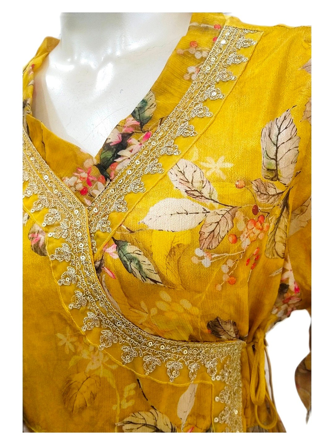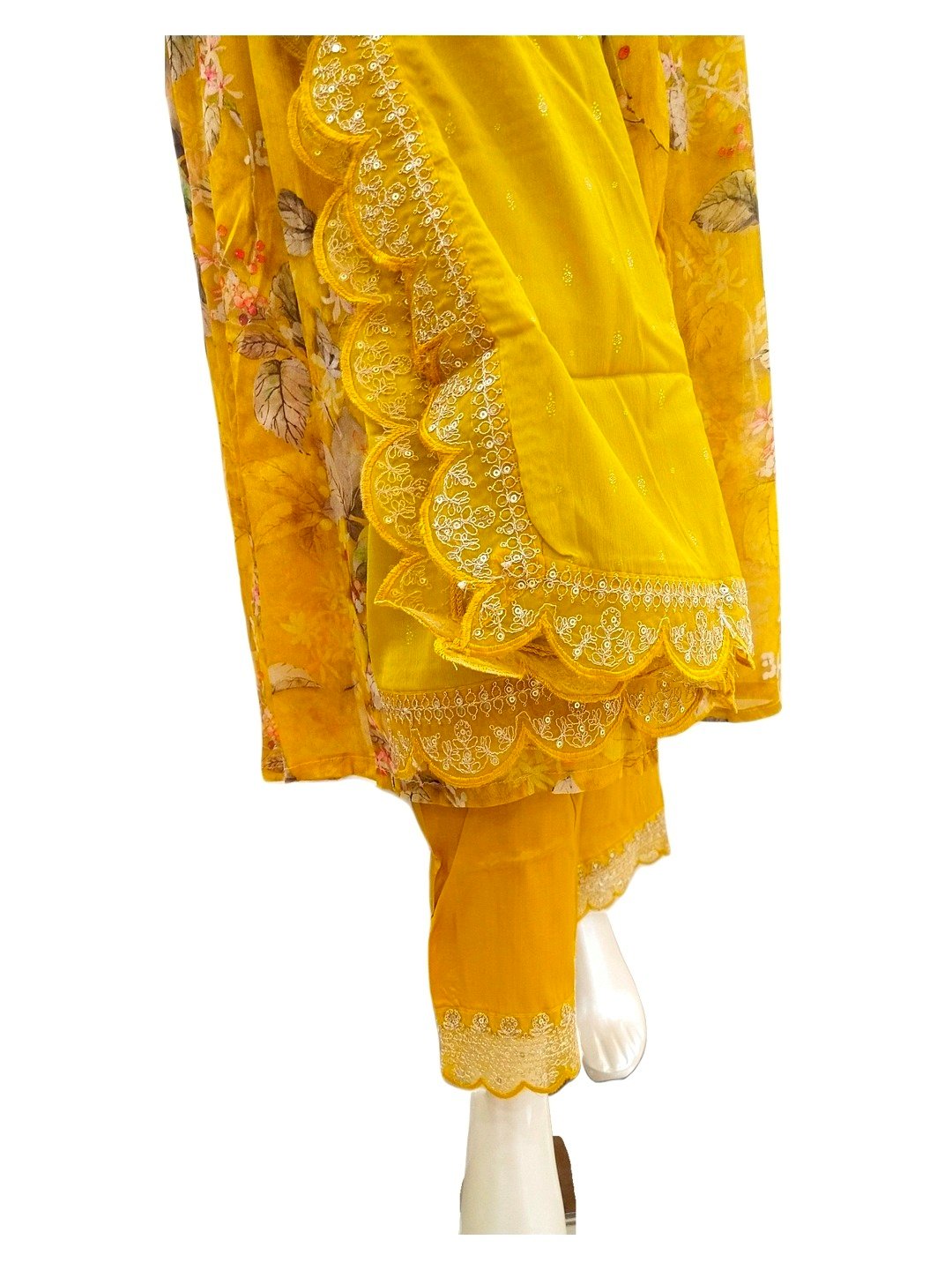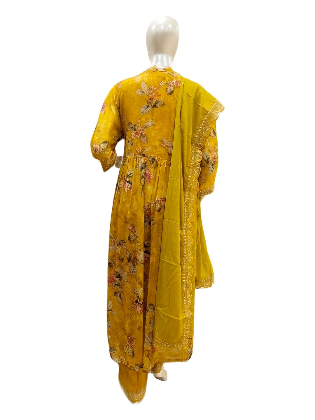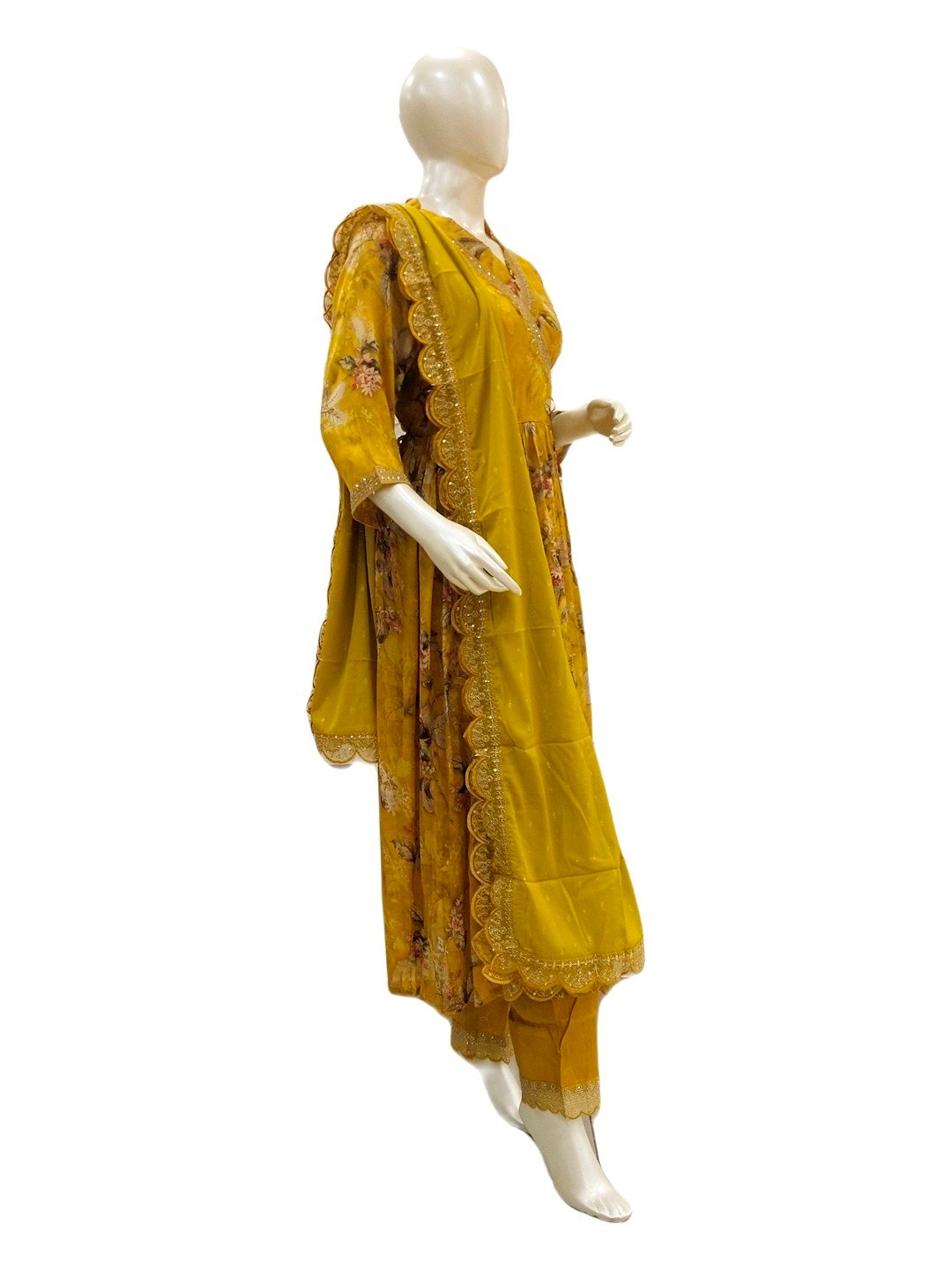 Jasvi Collections brings you an Beautiful Suit in Mustard Colour fabric and Border with Golden Thread work. It has a bottom with ornate golden thread work and comes with a Heavy Dupatta.