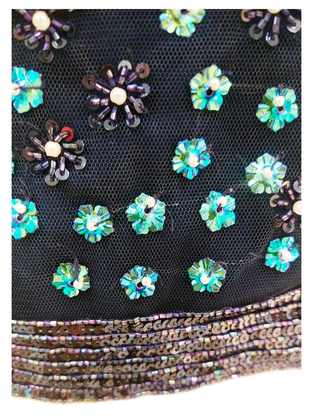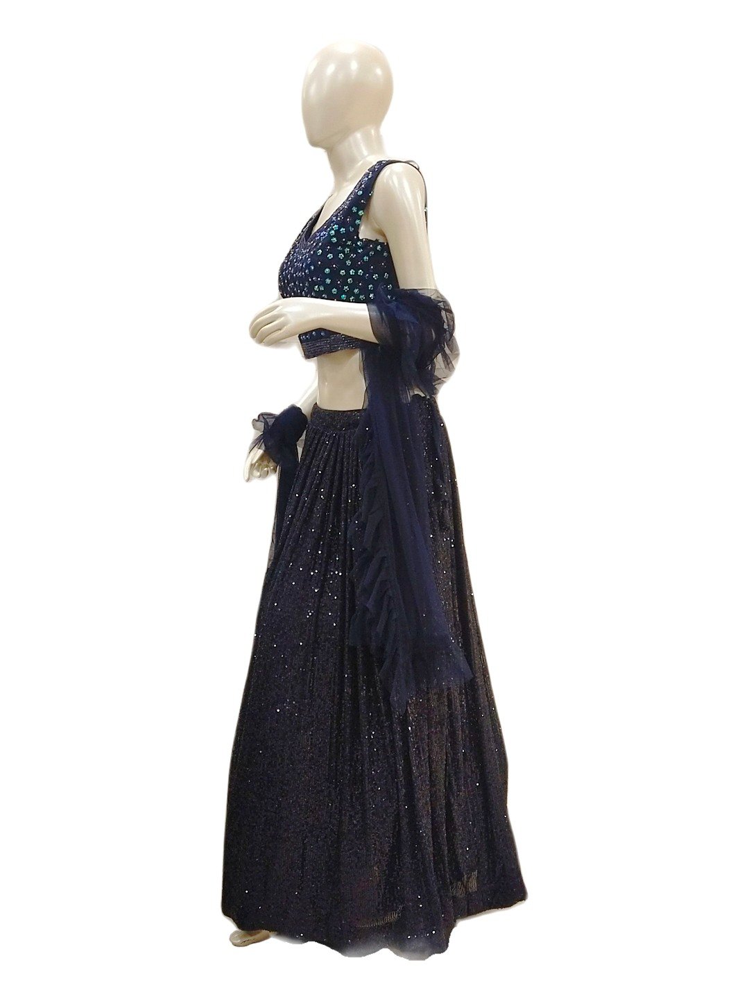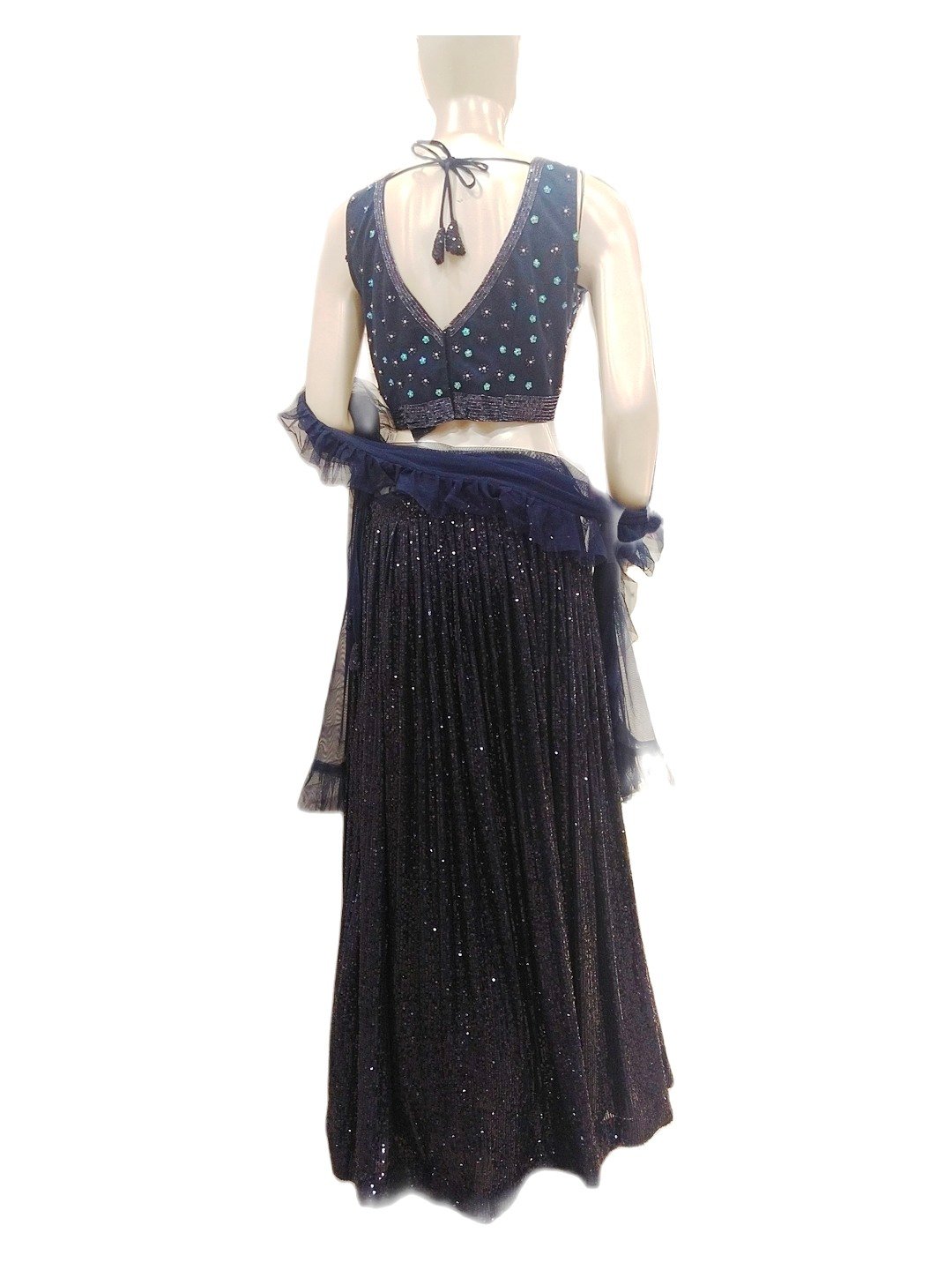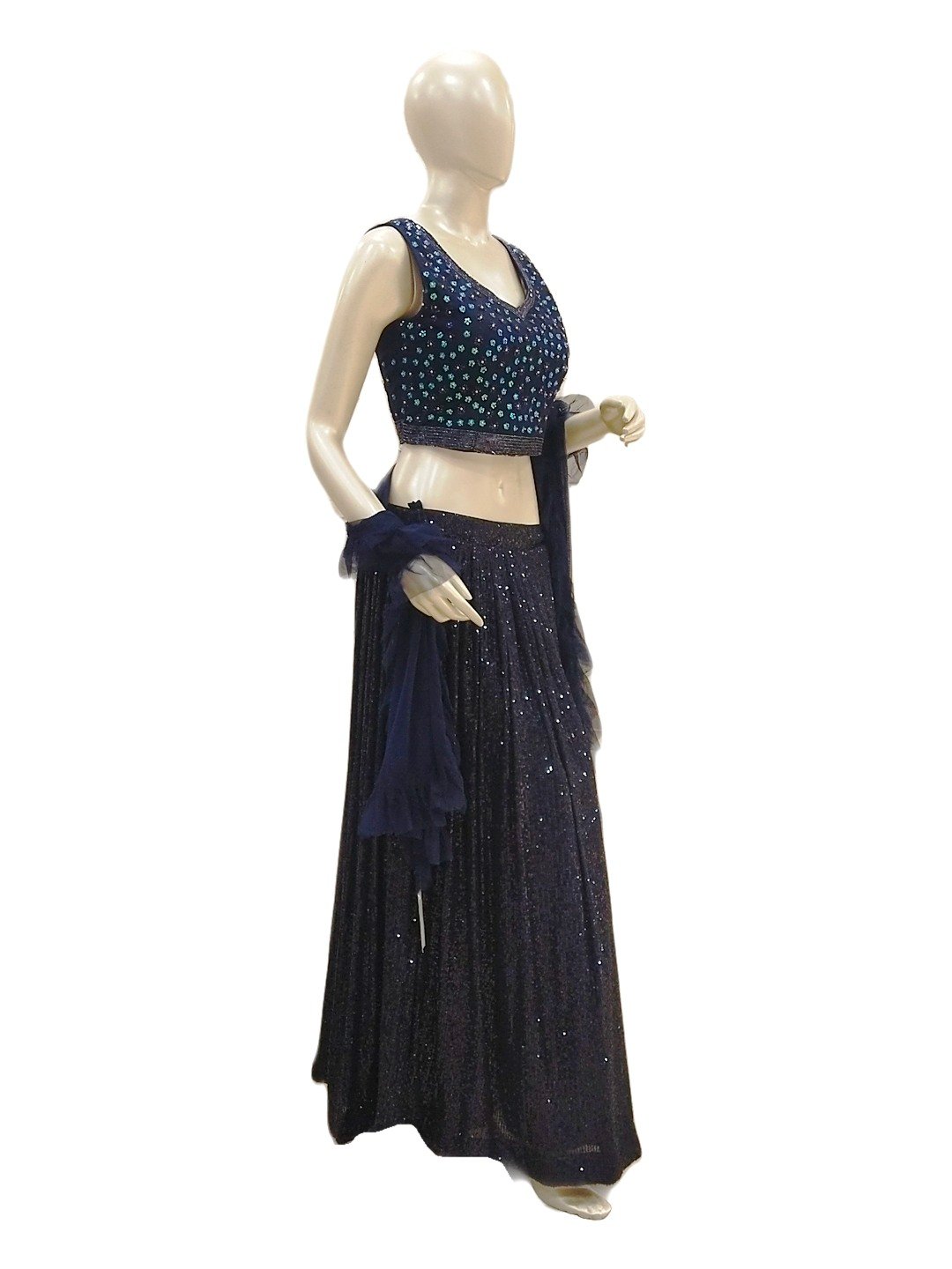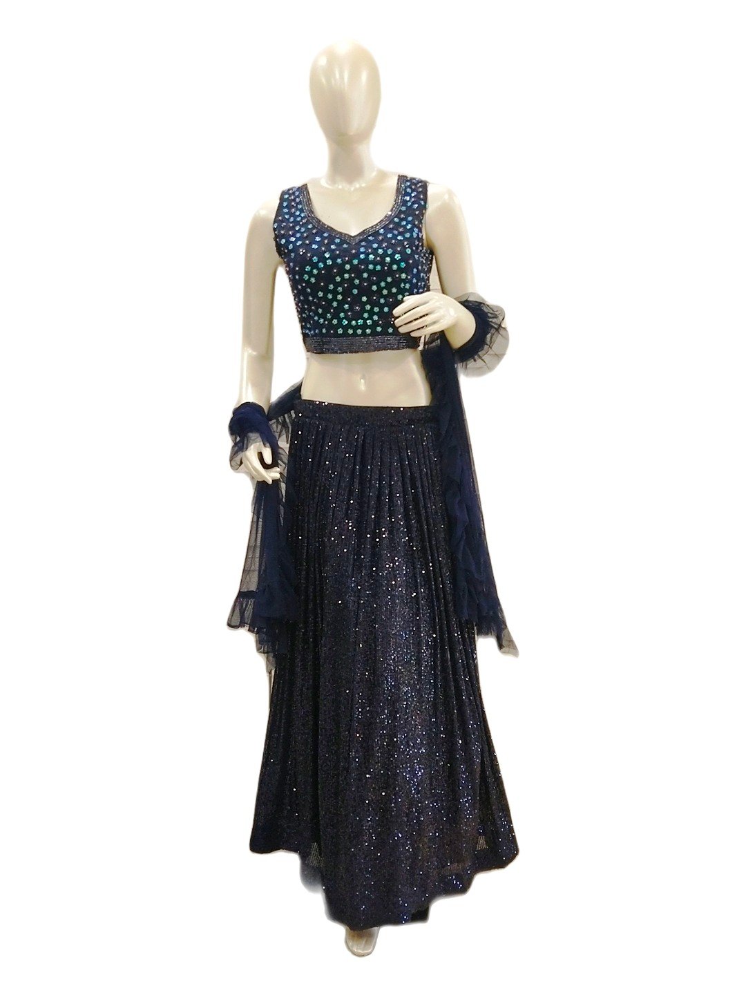 Jasvi Collections brings you a Girlish Croptop Skirt Set in Navy Blue Colour net fabric. It has an ornate Blouse with Motifs of Sequins and Moti and comes with a Heavy sequins skirt and Net Dupatta.