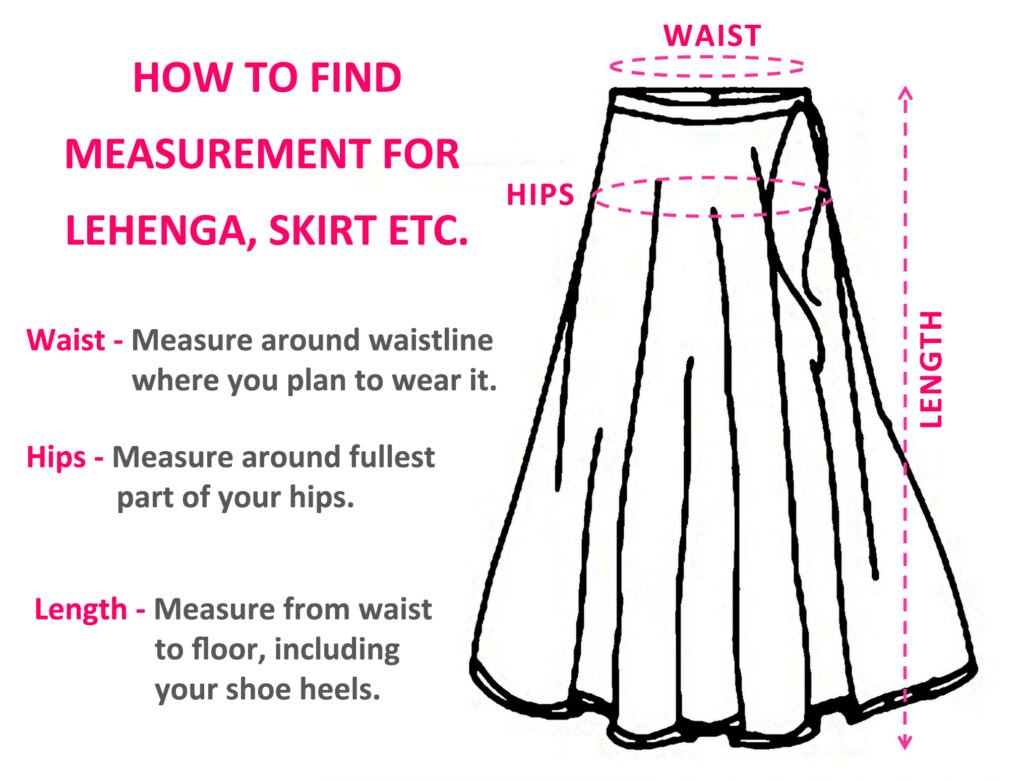 ABOVE MEASUREMENTS ARE OF ACTUAL LEHENGA / SKIRT WITH ADUSTABLE WAIST USING ELASTIC OR STRING