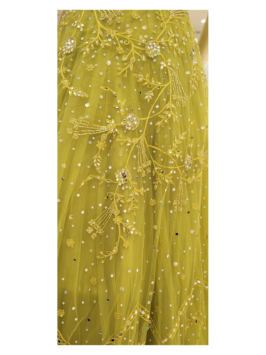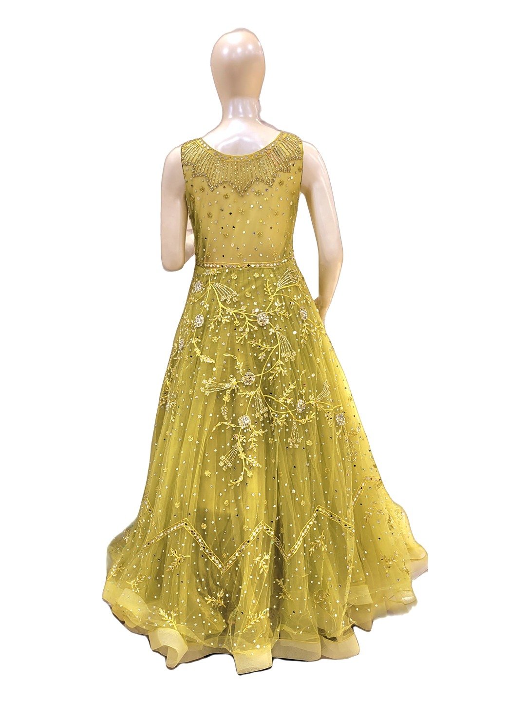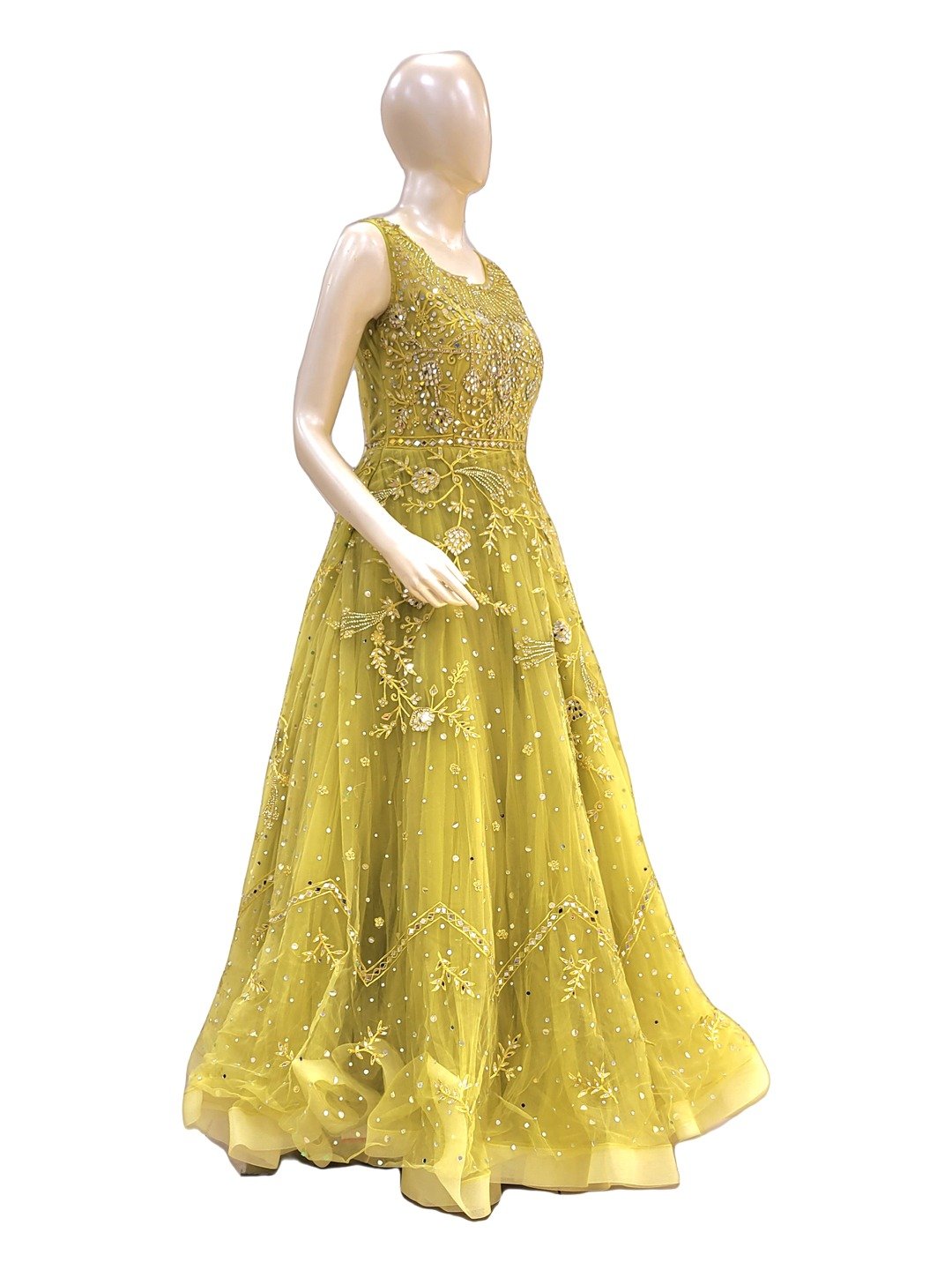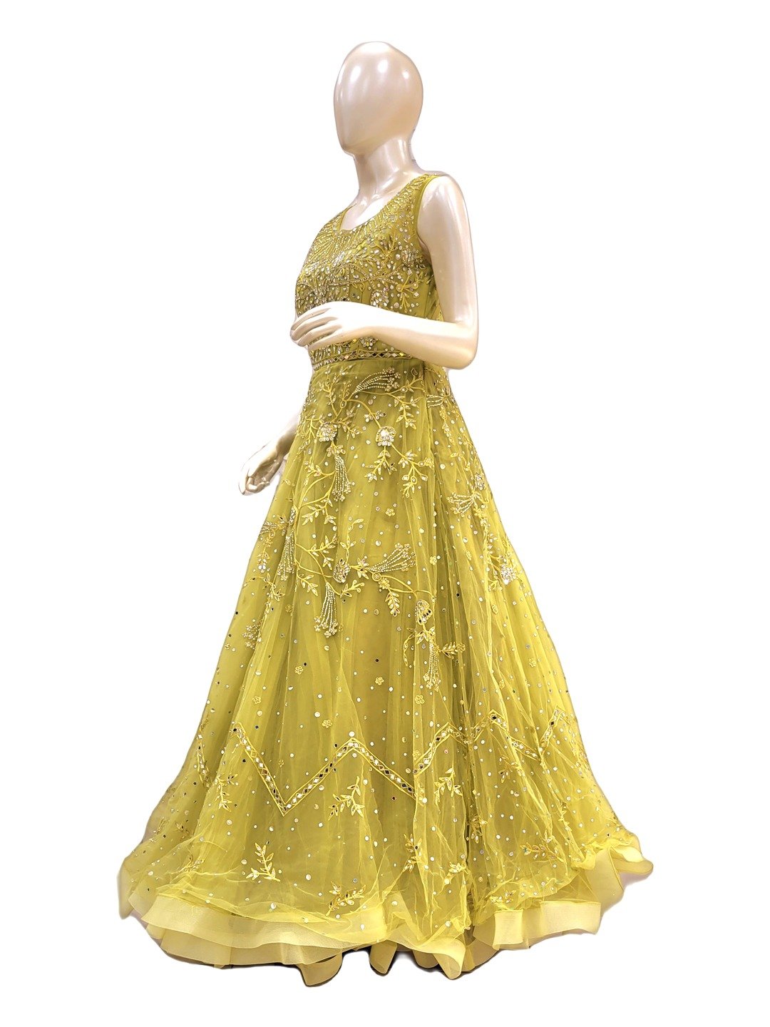 Jasvi Collections brings you an Adorable Princess Gown in Olive Green Colour net fabric and beautiful stone and thread work.