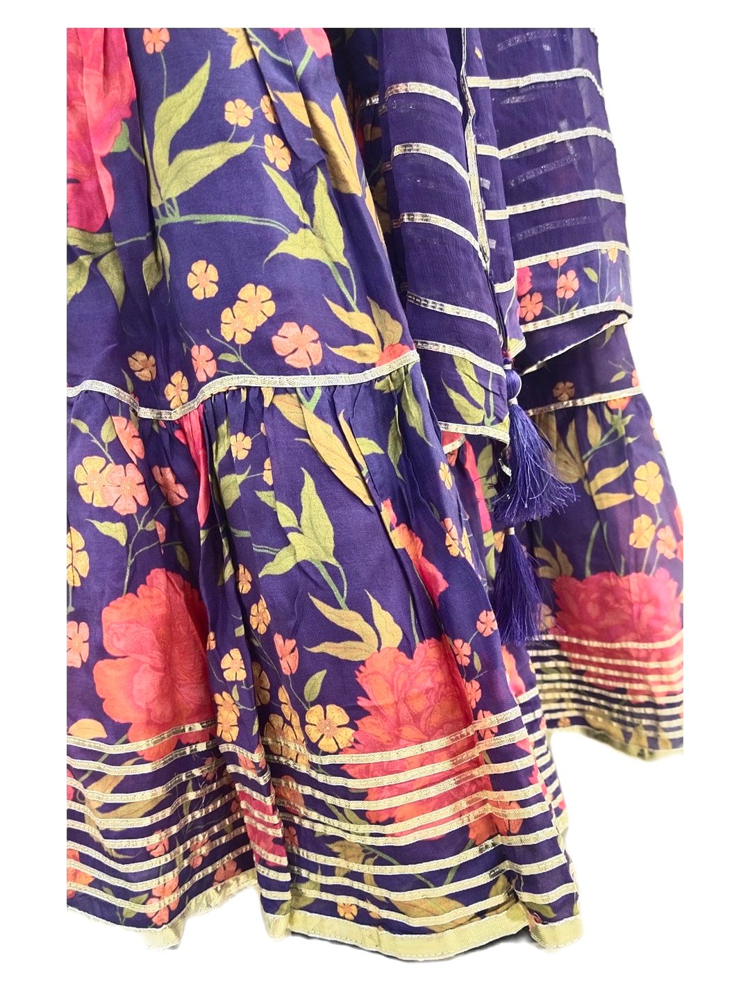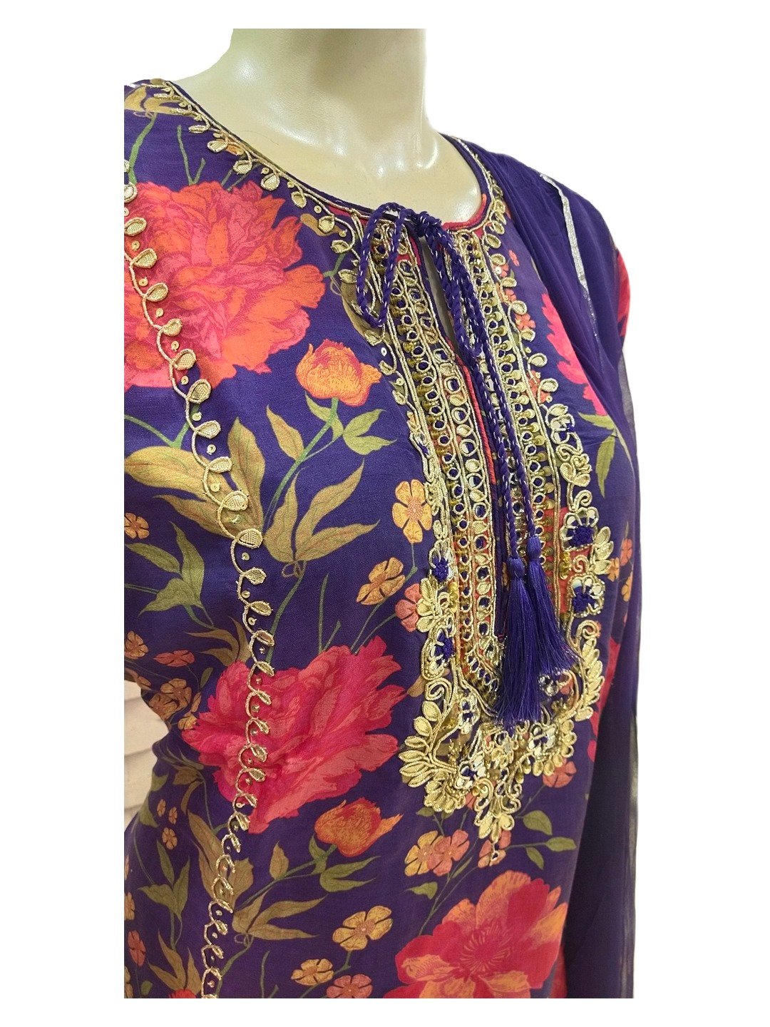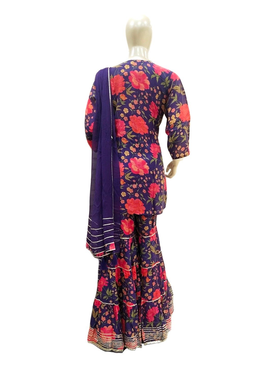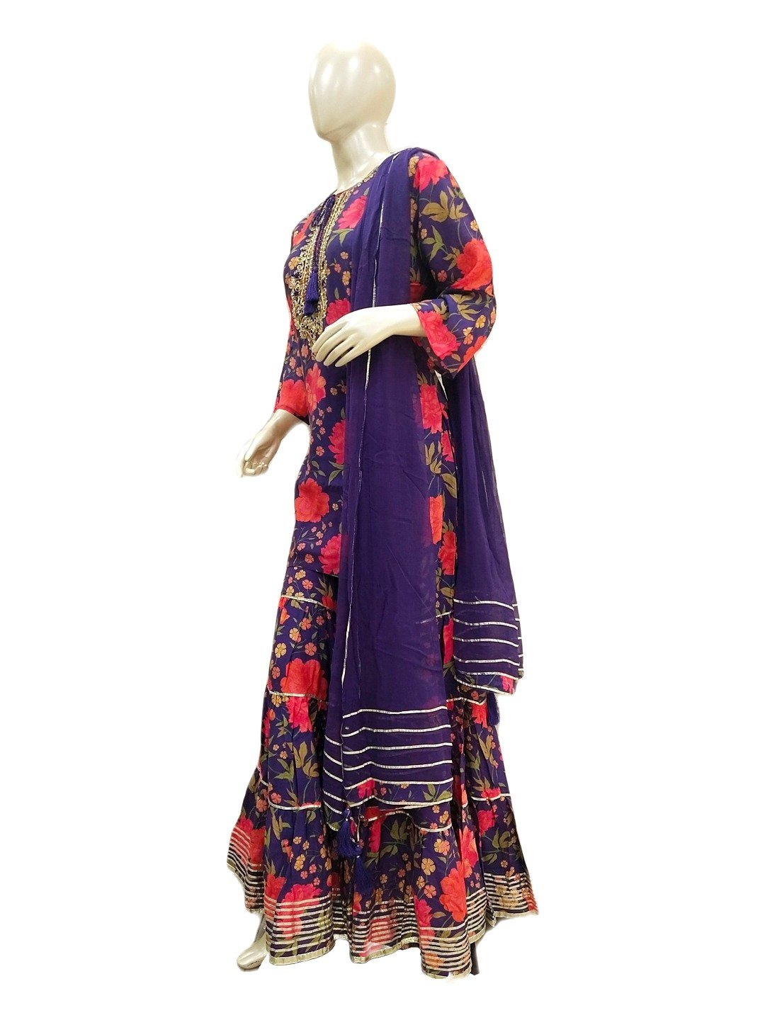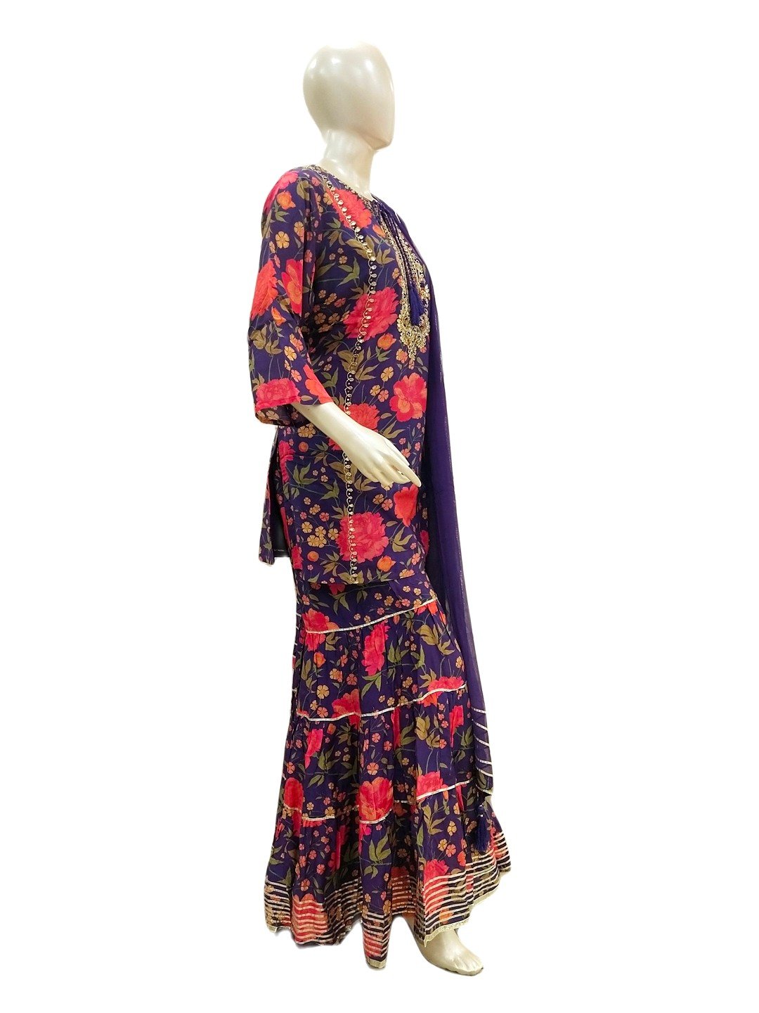 Jasvi Collections brings you a Fabulous Suit in Purple Colour fabric with Floral Prints and Gota work. It comes with a heavy Plazo and Heavy Chiffon Dupatta.