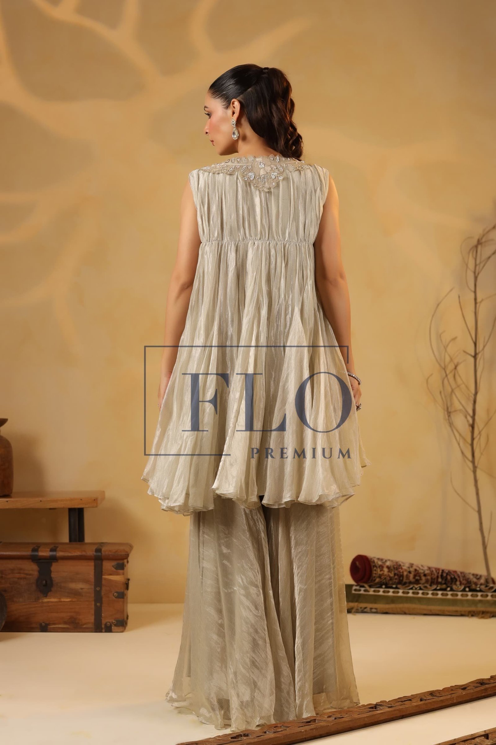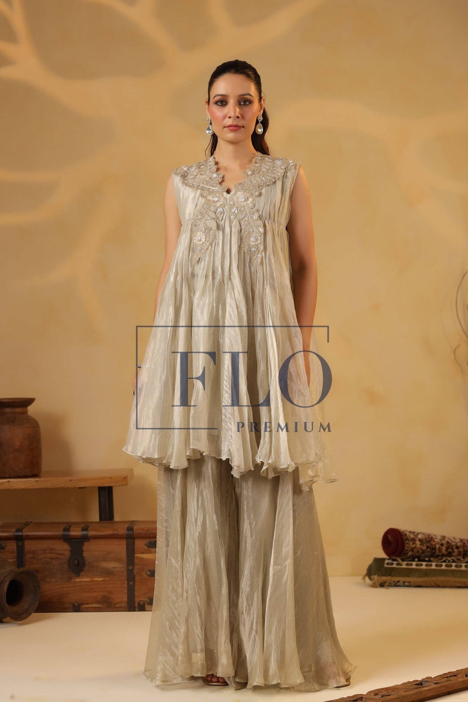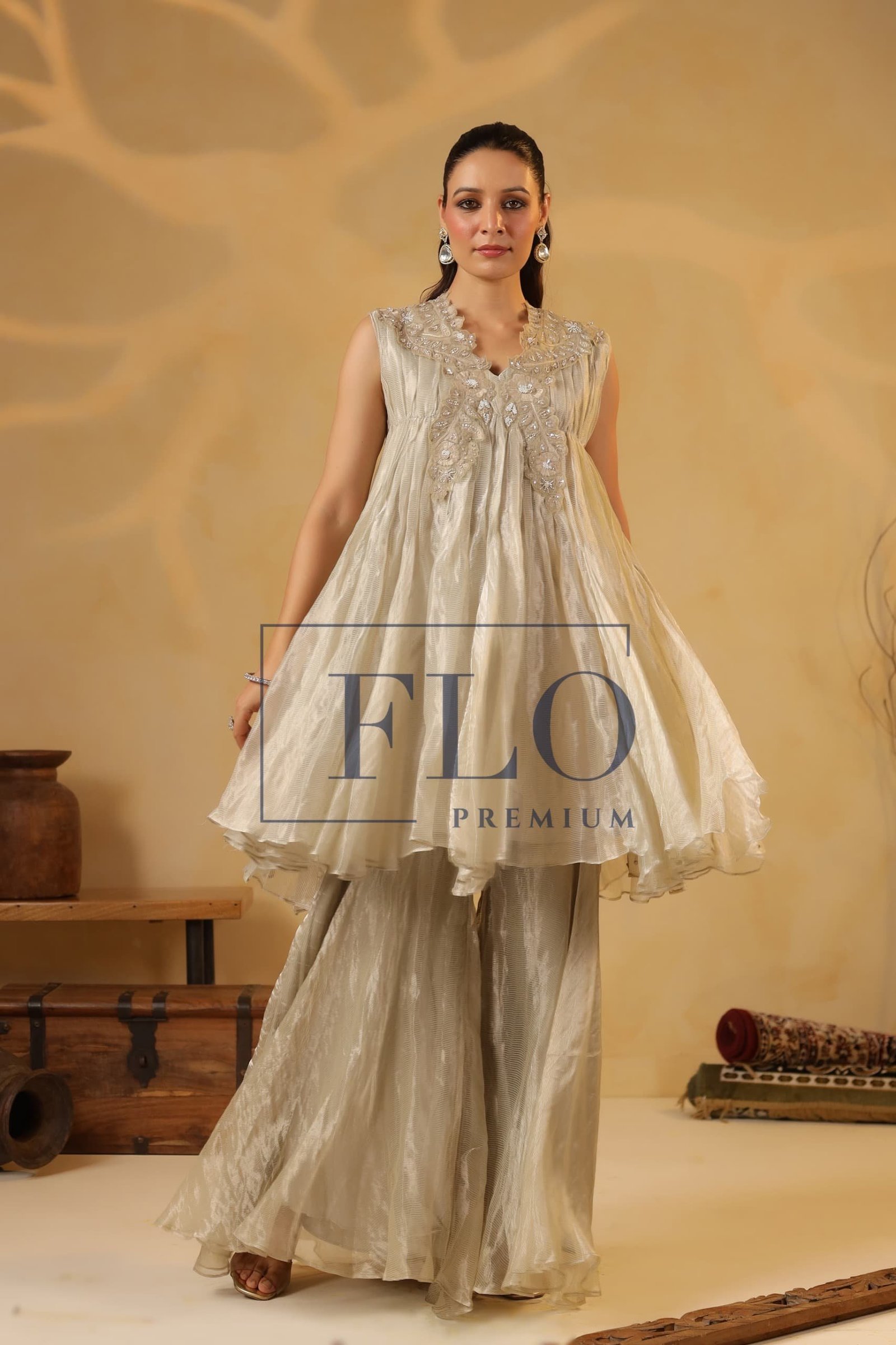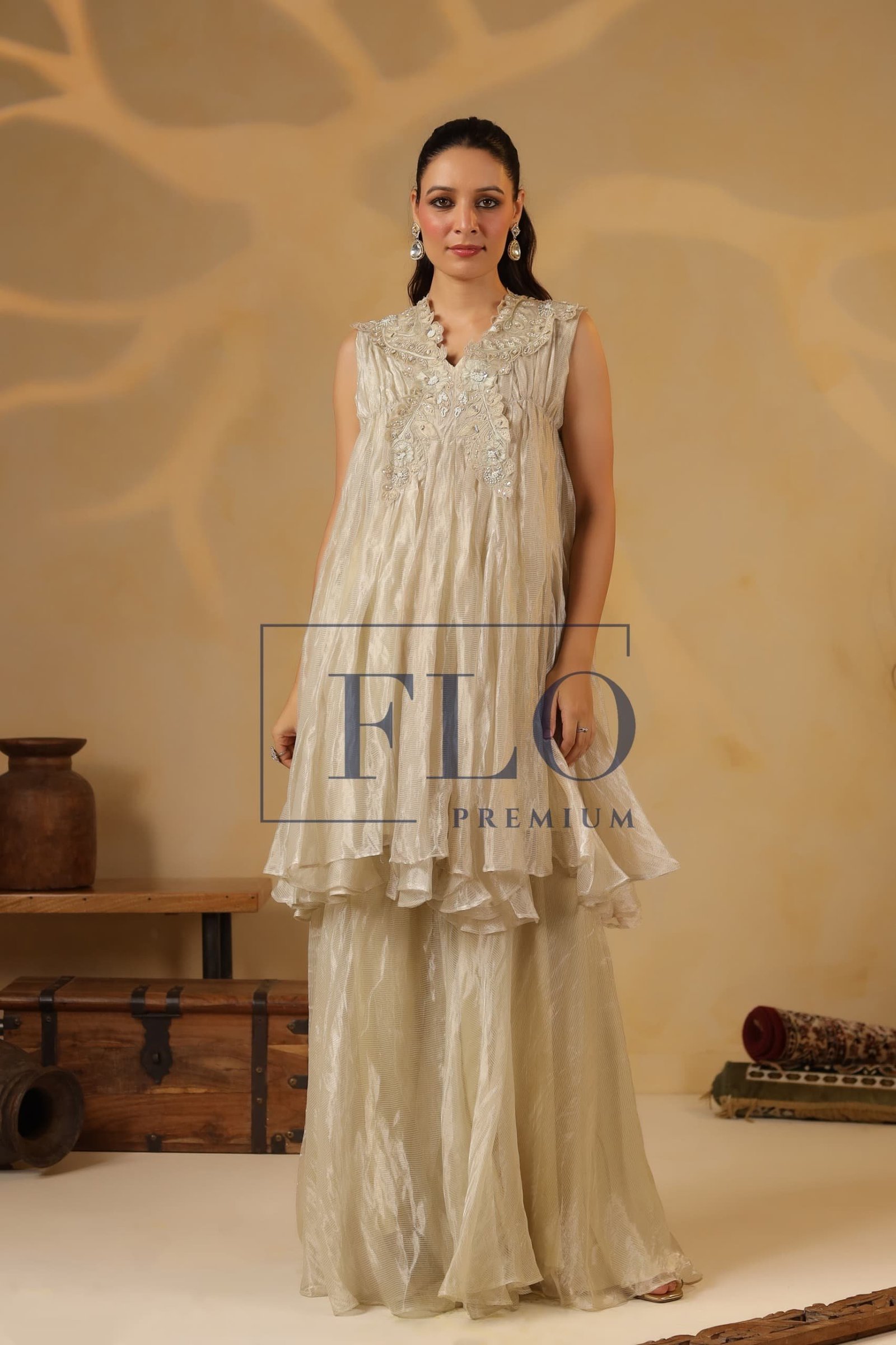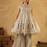 Jasvi Collections brings you a Gorgeous Indowestern in Ivory tissue fabric.